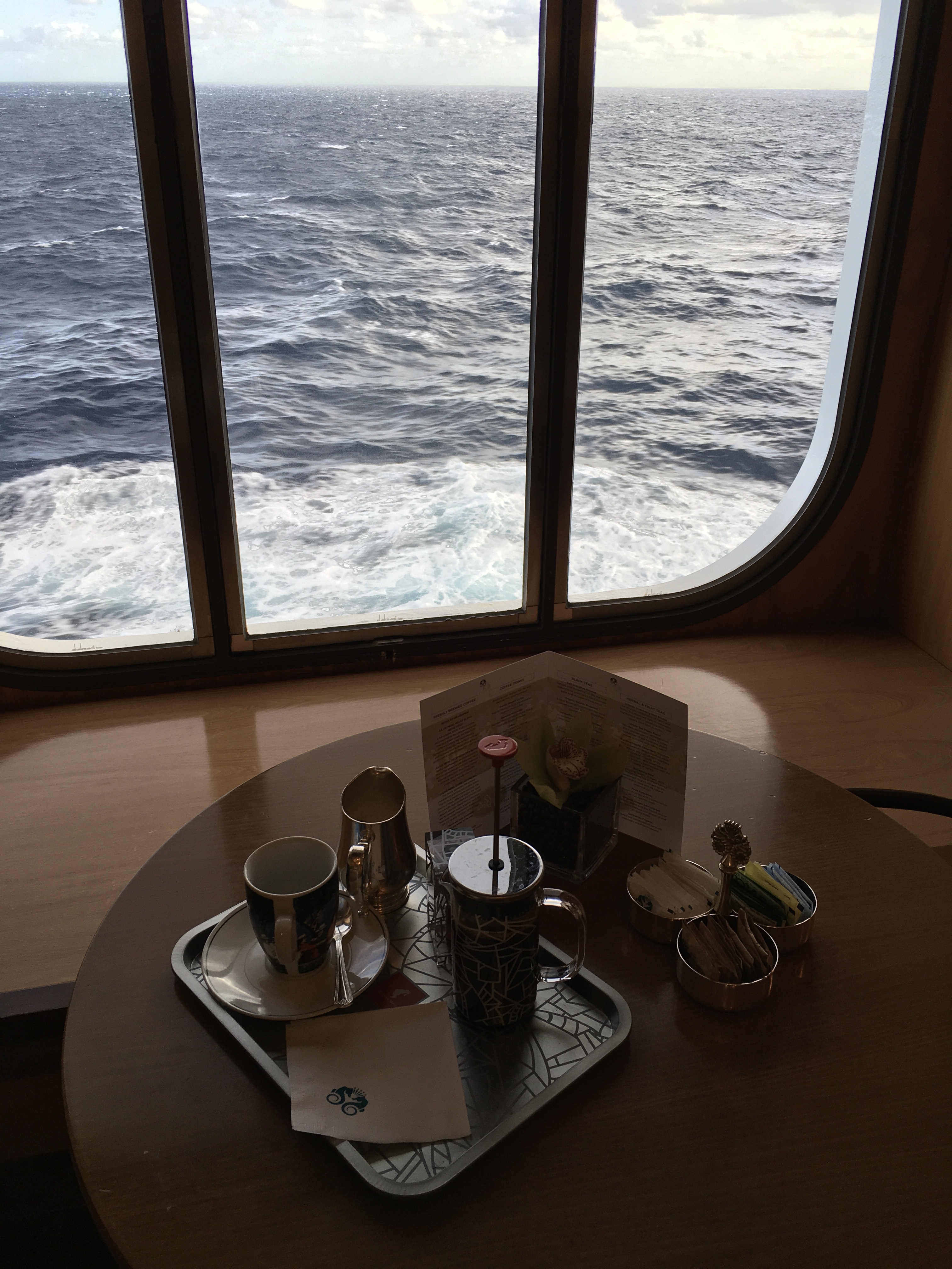 This morning we were awakened by the rising sun and hit the bistro for cappuccinos and a latte to go before heading up for breakfast overlooking the seas